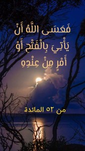 فالأمر في هذه الآيات الكريمة هو ما أنزله اللهُ تعالى من قرآن، أو ما سبق وأن أنزله من كتاب على مَن سبق سيدَنا محمد صلى الله تعالى عليه وسلم من رسله الكرام عليهم السلام. وهذا هو عين المعنى الذي بوسعنا أن نتبيَّنه إذاما نحن تدبَّرنا الآية الكريمة (فَتَرَى الَّذِينَ فِي قُلُوبِهِمْ مَرَضٌ يُسَارِعُونَ فِيهِمْ يَقُولُونَ نَخْشَى أَنْ تُصِيبَنَا دَائِرَةٌ فَعَسَى اللَّهُ أَنْ يَأْتِيَ بِالْفَتْحِ أَوْ أَمْرٍ مِنْ عِنْدِهِ فَيُصْبِحُوا عَلَى مَا أَسَرُّوا فِي أَنْفُسِهِمْ نَادِمِينَ) (52 المائدة).