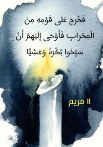 خرج سيدُنا زكريا عليه السلام من المحراب، من بعد قضائه الصلاة على قومه خروجاً بيَّنته الآية الكريمة (فَخَرَجَ عَلَى قَوْمِهِ مِنَ الْمِحْرَابِ فَأَوْحَى إِلَيْهِمْ أَنْ سَبِّحُوا بُكْرَةً وَعَشِيًّا) (11 مريم).