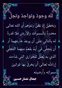لله تعالى وجودٌ ضاربٌ في الأزل ممتدٌ إلى أبد الآبدين. وهذا الوجود إلهي محضٌ فلا تواجدَ لمخلوقٍ في حضرته الإلهية المقدسة. وهذا الوجود الإلهي محيطٌ بكونٍ خلقه اللهُ تعالى سمواتٍ وأرضين. والوجودُ المخلوقُ هذا ما كان له أن ينبثق إلى الوجود لولا أن اللهَ تعالى خلقَه خلْقاً من بعد خلقٍ في أيامٍ ست. وهذا الوجود المخلوق ما كان له أن تقوم قائمة لولا أن اللهَ تعالى، الموجودَ خارجَه، متواجدٌ داخله تواجداً يُديم بقاءه حتى يأذن اللهُ بزواله يوم يزولُ كلُّ مخلوقٍ ويبقى وجهُ الخالق وحده. فتواجد الله تعالى في هذا الوجود المخلوق هو الذي يُمسك سمواته وأرضينه ويحول بالتالي دون زوالهما وتلاشيهما وفنائهما. فاللهُ نورُ هذا الوجود المخلوق الذي يتكفَّل تواجدُه الإلهي فيه ببقائه وديمومته حتى يحين موعد فنائه بحلول يوم القيامة.