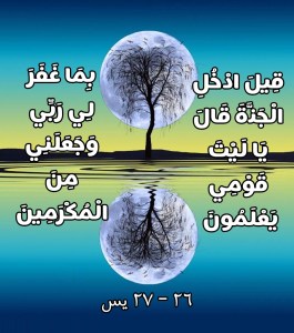 ولقد بالغَ القومُ في تكذيبِ رسُل الله الكرام هؤلاء، وفي الإعراض عن الرجُل المؤمن، فما كان من الله تعالى إلا أن أمَر رسُلَه الكرام هؤلاء بأن يُبيدوهم عن بكرةِ أبيهم بلمحِ البصر. ولقد جزى اللهُ الرجلَ المؤمن خير جزاء إذ أمر تعالى ملائكتَه الكرام هؤلاء بأن يصطحبوه معهم إلى جنة المأوى في رحلةِ معراجٍ تُذكِّر بما سبق وحدثَ قبل آلافٍ من السنين لا يعلم مقدارَها إلا الله، وذلك عندما أرسلَ اللهُ تعالى ملائكتَه الكرام لإبادة مَن كان يُفسد في الأرض ويسفك الدماء، ولاصطحابِ آدمَ وزوجِه إلى ذات الجنة التي أُدخلها مؤمن يس بعد آلافٍ وآلافٍ من السنين.