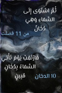وردت كلمة “دخان” في القرآن العظيم مرتين اثنتين: (ثُمَّ اسْتَوَى إِلَى السَّمَاءِ وَهِيَ دُخَانٌ) (من 11 فصلت)، (فَارْتَقِبْ يَوْمَ تَأْتِي السَّمَاءُ بِدُخَانٍ مُبِينٍ) (10 الدخان). والدُّخان يأتي في القرآن العظيم بمعنيَن اثنين أولهما هو ما ورد ذكره في سورة فصلت في إشارة من الله تعالى إلى ما كانت عليه السماء قبل أن يجعلها الله سبع سموات. فالسماء كانت دخاناً والدخان هنا هو ضباب الماء وبخاره (ثُمَّ اسْتَوَى إِلَى السَّمَاءِ وَهِيَ دُخَانٌ فَقَالَ لَهَا وَلِلْأَرْضِ اِئْتِيَا طَوْعًا أَوْ كَرْهًا قَالَتَا أَتَيْنَا طَائِعِينَ. فَقَضَاهُنَّ سَبْعَ سَمَاوَاتٍ فِي يَوْمَيْنِ وَأَوْحَى فِي كُلِّ سَمَاءٍ أَمْرَهَا وَزَيَّنَّا السَّمَاءَ الدُّنْيَا بِمَصَابِيحَ وَحِفْظًا ذَلِكَ تَقْدِيرُ الْعَزِيزِ الْعَلِيمِ) (11 -12 فصلت).