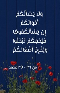فاللهُ تعالى ما أمرنا بأن نُنفق من أموالِنا إلا تزكيةً لنفوسنا، ولذلك كانت الزكاةُ ركناً من أركان الإسلام الخمسة. ولكننا على ما يبدو قد نسينا، من جملة ما نسينا، أن نستذكر ما جاءتنا به سورة محمد من تبيانٍ للعلة التي علَّل اللهُ تعالى بها لأمره لنا بأن ننفق من أموالنا على مَن أُمرنا بألا نبخل عليهم (وَلَا يَسْأَلْكُمْ أَمْوَالَكُمْ(36) إِنْ يَسْأَلْكُمُوهَا فَيُحْفِكُمْ تَبْخَلُوا وَيُخْرِجْ أَضْغَانَكُم).