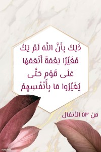 ويؤيِّد هذا الذي أذهبُ إليه من تفسير للآية الكريمة 11 الرعد تدبُّرُ ما جاءتنا به الآية الكريمة 53 الأنفال (ذَلِكَ بِأَنَّ اللَّهَ لَمْ يَكُ مُغَيِّرًا نِعْمَةً أَنْعَمَهَا عَلَى قَوْمٍ حَتَّى يُغَيِّرُوا مَا بِأَنْفُسِهِمْ).