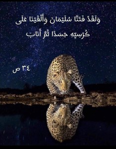 فتنَ اللهُ سيدَنا سليمان عليه السلام، وذلك بأن ألقى على كرسيِهِ جسداً (وَلَقَدْ فَتَنَّا سُلَيْمَانَ وَأَلْقَيْنَا عَلَى كُرْسِيِّهِ جَسَدًا ثُمَّ أَنَابَ) (34 ص). والذي حدث هو أنَّ اللهَ تعالى أمرَ جِنيّاً فتجسَّد بهيأة سيدِنا سليمان وأجلسَه على كرسيِهِ وذلك قبيل أن يدلف سيدنا سليمان إلى مجلسه ليجلسَ على كرسيه، فكان ما كان من فتنةٍ امتُحِن بها عليه السلام لمرآهُ واحداً آخرَ غيره يجلسُ محلَّه كأنه هو وذلك لأن اللهَ صيَّر ذلك الجني فجعله نسخةً طبق الأصل عن سيدنا سليمان!
