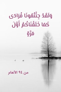 يُنبؤنا القرآنُ العظيم بأننا سنجيءُ اللهَ تعالى يومَ القيامةِ فرادى، كلاً على حدة، وذلك كما جئناهُ أولَ مرة (وَلَوْ تَرَى إِذِ الظَّالِمُونَ فِي غَمَرَاتِ الْمَوْتِ وَالْمَلَائِكَةُ بَاسِطُو أَيْدِيهِمْ أَخْرِجُوا أَنْفُسَكُمُ الْيَوْمَ تُجْزَوْنَ عَذَابَ الْهُونِ بِمَا كُنْتُمْ تَقُولُونَ عَلَى اللَّهِ غَيْرَ الْحَقِّ وَكُنْتُمْ عَنْ آيَاتِهِ تَسْتَكْبِرُونَ. وَلَقَدْ جِئْتُمُونَا فُرَادَى كَمَا خَلَقْنَاكُمْ أَوَّلَ مَرَّةٍ) (من 93 – من 94 الأنعام)، (وَيَوْمَ نُسَيِّرُ الْجِبَالَ وَتَرَى الْأَرْضَ بَارِزَةً وَحَشَرْنَاهُمْ فَلَمْ نُغَادِرْ مِنْهُمْ أَحَدًا. وَعُرِضُوا عَلَى رَبِّكَ صَفًّا لَقَدْ جِئْتُمُونَا كَمَا خَلَقْنَاكُمْ أَوَّلَ مَرَّةٍ بَلْ زَعَمْتُمْ أَلَّنْ نَجْعَلَ لَكُمْ مَوْعِدًا) (47 -48 الكهف).