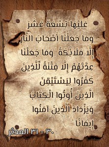 فهذا العدد (19) يمثل عِدَّةَ أصحاب النار، وهؤلاء هم زبانيةُ جهنم من الملائكةِ الذين أوكلَ اللهُ تعالى أمرَ أصحابِ النارِ إليهم. وهذه الحقيقة لم يكن أمِّيو قريش على معرفةٍ بها، وهي حقيقةٌ كان اللهُ تعالى قد عرَّف بها أهلَ الكتاب من قبل، وهي من جملة الحقائق التي انطوت عليها كتبُ أهلِ الكتاب ولم يكن من سبيلٍ هنالك ليعرفَها سيدُنا محمد صلى الله تعالى عليه وسلم لولا أنَّ اللهَ تعالى عرَّفَه بها بقرآنه العظيم.