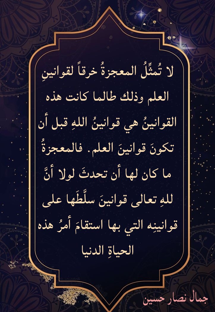 للهِ تعالى قوانينٌ إلهيةٌ لولا تسلُّطُها على الوجودِ ما قامت للوجودِ قائمة. والمعجزاتُ والكراماتُ تحدثُ بتسلُّطِ قوانينَ إلهيةٍ أخرى على تلك التي يقومُ عليها هذا الوجود، ولذلكَ فإنَّ المعجزاتِ والكراماتِ لا تُمثِّلُ خرقاً لقوانين العلم التي هي في حقيقتِها قوانينُ اللهِ تعالى فلا قدرةَ لشيءٍ والحالُ هذه على أن يخرقَها. والمعجزاتُ والكراماتُ لها قوانينٌ إلهيةٌ تحدثُ بمقتضاها. وقوانينُ المعجزاتِ والكرامات هذه هي “قوانينُ الغيب” التي لها أن تتسلَّطَ على “قوانينِ الشهادةِ” التسلُّطَ الذي بمقتضاهُ تحدثُ المعجزاتُ والكرامات.