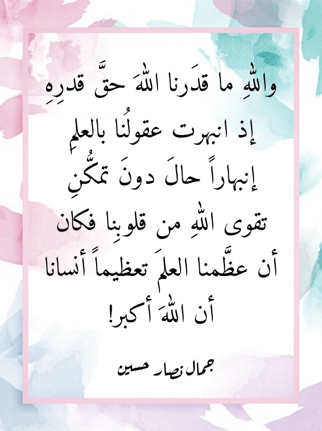 وهكذا، وفي غمرةِ انبهارِنا بالعلم، فاتنا أن نستذكرَ أنَّ الإيمانَ بدينِ اللهِ تعالى يقتضي منا وجوبَ أن يكونَ عندنا اللهُ أكبرَ من العلمِ ومما يأمرُنا به طالما كان هذا الذي يأمرُنا به العلمُ يضطرُّنا إلى تأويلِ نصوصِ القرآنِ العظيم تأويلاً يحيدُ بنا عن جادةِ الحق بهذا الذي أصبحنا عليه من تأليهٍ للعلم!