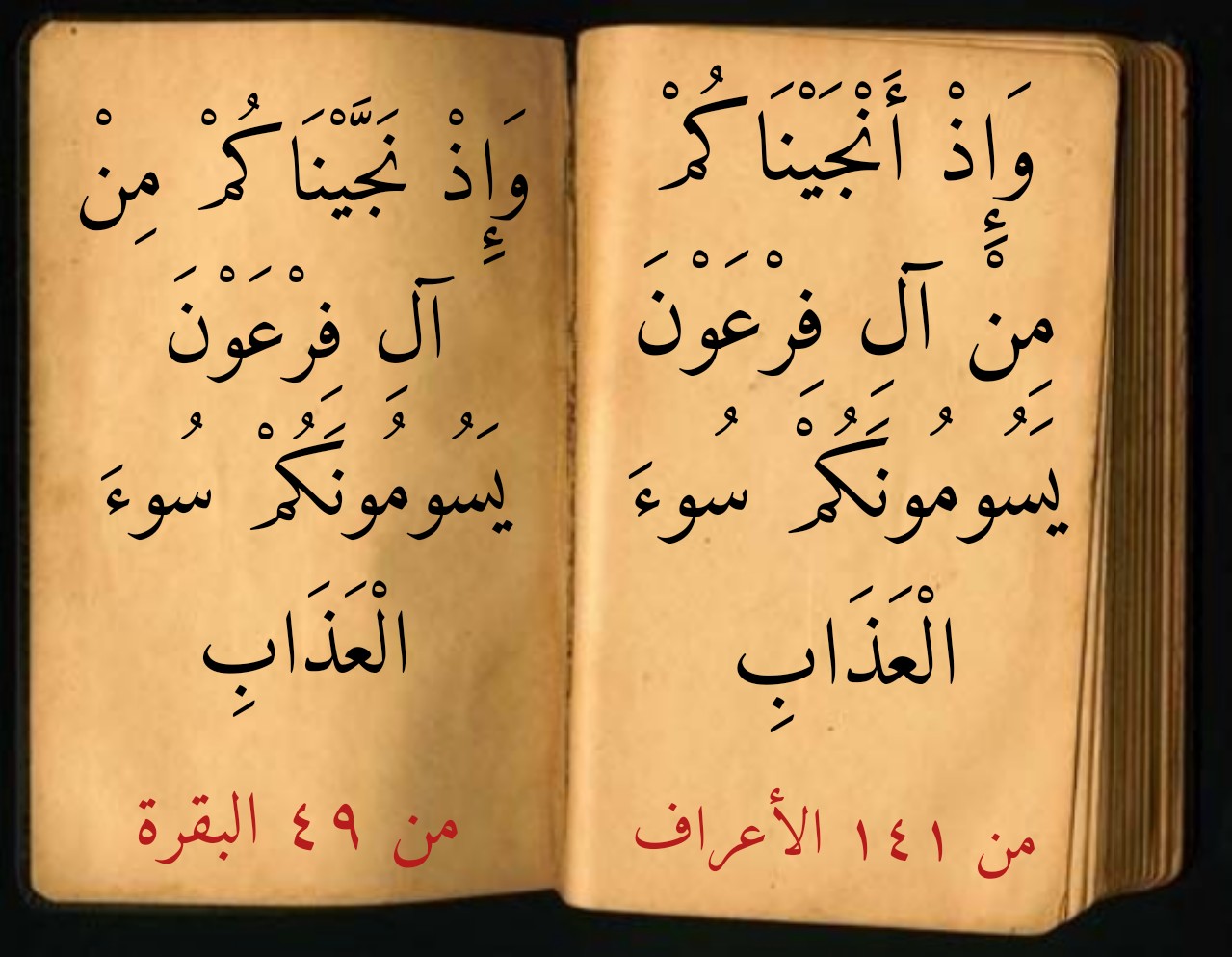 وفي هذا المنشور سوف أوردُ آيتين كريمتين أُخريين أتحدى بهما القائلَ بألا ترادف في القرآن العظيم أن يُبيِّنَ لنا الفرقَ في المعنى بين الكلمتين القرآنيتين “أنجيناكم” و”نجَّيناكم” في الآيتين الكريمتين التاليتين: (وَإِذْ نَجَّيْنَاكُمْ مِنْ آلِ فِرْعَوْنَ يَسُومُونَكُمْ سُوءَ الْعَذَابِ) (من 49 البقرة)، (وَإِذْ أَنْجَيْنَاكُمْ مِنْ آلِ فِرْعَوْنَ يَسُومُونَكُمْ سُوءَ الْعَذَابِ) (من 141 الأعراف)