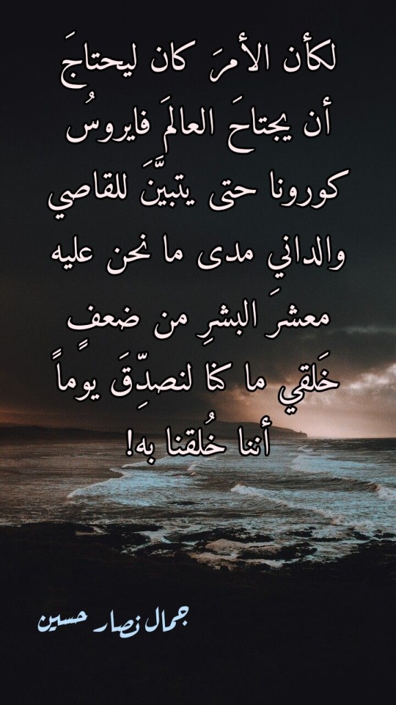 إلا أن اللهَ تعالى ما كان ليذرَ هؤلاءِ الملاحدةِ يفرحون بنصرِهم المزعومِ هذا، فكان أن أجازَ للطبيعةِ أن تردَّ على غرورِ الإنسان رداً كشفَ هشاشةَ ما هو عليه بنيانُه الحضاري المتوهَّم! وما ظهورُ وتفشِّي جائحة كورونا إلا هذا الدليل الإلهي على صدقِ قرآنِ الله العظيم فيما جاءنا به من تبيانٍ لضعف الإنسان. وإلا فكيف لنا أن نُعلِّلَ لما أصبحنا عليه اليوم من اقتناعِ تام بأننا بشرٌ ضعفاء فلا حولَ لنا ولا قوة ولا قدرة على مجابهة هذا الفايروس الذي كشف النقابَ عما نحن عليه من ضعفٍ خُلقنا به وأصررنا على إنكارِه؟!