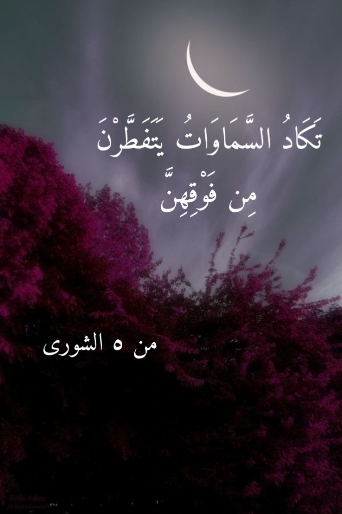 يُعينُ على تبيُّنِ المعنى الذي تنطوي عليه الآية الكريمة (تَكَادُ السَّمَاوَاتُ يَتَفَطَّرْنَ مِنْ فَوْقِهِنَّ) (من 5 الشورى) أن نتدبَّرها على هَديٍ من الآيتين الكريمتين (وَالْمَلَائِكَةُ وَهُمْ لَا يَسْتَكْبِرُونَ. يَخَافُونَ رَبَّهُمْ مِنْ فَوْقِهِمْ وَيَفْعَلُونَ مَا يُؤْمَرُونَ) (من 49- 50 النحل). فالملائكةُ الكرام يخافون اللهَ الذي أشارت الآية الكريمة 50 النحل أعلاه إلى أنه تعالى “من فوقهم”. وبذلك يتبيَّنُ لنا أن مراد الآية الكريمة 5 الشورى أعلاه هو أن السموات توشك أن يتفطرن وذلك لأن اللهَ تعالى هو مَن فوقهن. فلكأن المعنى الذي تشتملُ عليه هذه الآية الكريمة بالإمكانِ أن تُلخِّصَه فتوجِزَه العبارة التالية: “توشكُ السمواتُ أن يتداعَين فيهوين متلاشياتٍ وذلك لأن اللهَ تعالى فوقهن”. فاللهُ تعالى موجودٌ خارجَ السمواتِ والأرض، ويفصل بين عالم عرشِه العظيم وعالم كرسِّه، الذي وسع هذه السموات والأرض، حجابٌ هو أقطارُ السموات والأرض الوارد ذكره في سورة الرحمن. فاللهُ تعالى، الموجود خارج السموات والأرض فلا تواجدَ لمخلوقٍ معه في عالم عرشه، هو الله تعالى المتواجد في عالم كرسيه: عالم السموات والأرض.