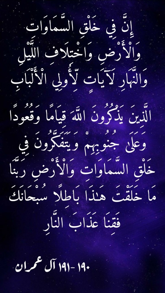يتبيَّنُ لنا بتدبُّرِ هاتين الآيتين الكريمتين ما للتفكُّرِ في خلقِ السمواتِ والأرضِ من قدرةٍ على الارتقاءِ بـ “حالِ” العبد مع اللهِ تعالى إلى مصافٍ تجعلُهُ من “أولي الألباب”. ولقد حرصَ القرآنُ العظيم على أن يُبيِّنَ لمتدبِّرِه هذا الذي بمقدورِ “التفكُّرِ” أن يُحقِّقَهُ لكلِّ مَن امتثلَ لأمرِ اللهِ تعالى وانصاعَ لما جاءَت به آياتُه الكريمة من تبيانٍ لما يقتضيهِ التديُّنُ الحق من إعمالِ فكرٍ وإدامةِ تفكُّرٍ (وَأَنْزَلْنَا إِلَيْكَ الذِّكْرَ لِتُبَيِّنَ لِلنَّاسِ مَا نُزِّلَ إِلَيْهِمْ وَلَعَلَّهُمْ يَتَفَكَّرُونَ) (من 44 النحل).