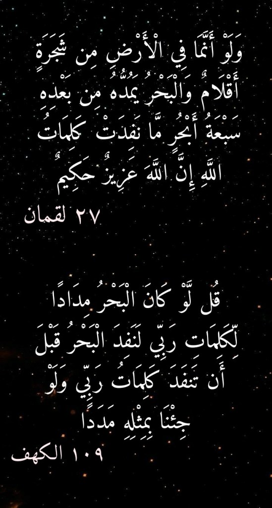 ولقد جاءتنا سورةُ الكهف بتوصيفٍ آخر لـ “كلمات الله” وذلك في الآية الكريمة 109 منها (قُلْ لَوْ كَانَ الْبَحْرُ مِدَادًا لِكَلِمَاتِ رَبِّي لَنَفِدَ الْبَحْرُ قَبْلَ أَنْ تَنْفَدَ كَلِمَاتُ رَبِّي وَلَوْ جِئْنَا بِمِثْلِهِ مَدَدًا).