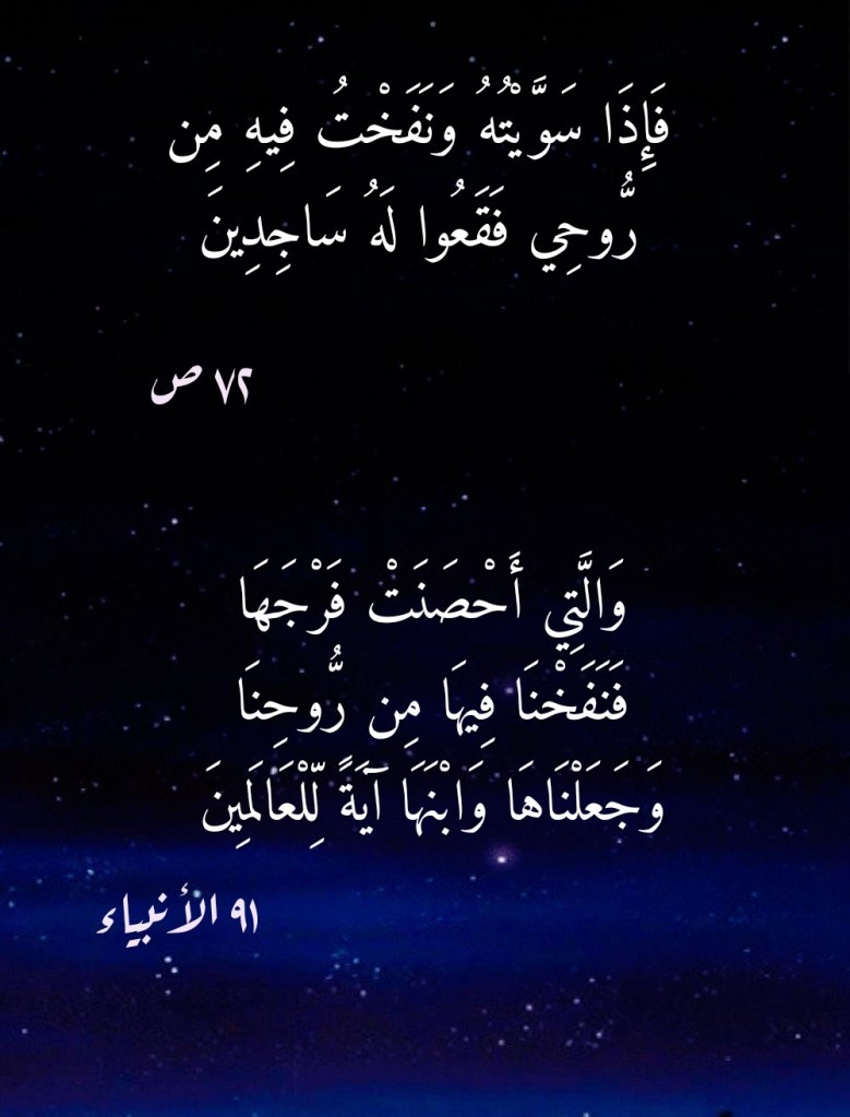 وبذلك يكونُ قد فاتَنا أنَّ نَفخَ اللهِ في آدمَ من روحِه ما هو إلا صيغةٌ قرآنيةٌ أخرى لما جاءتنا به سورةُ آل عمران في آيتها الكريمة 59، وذلك على قدرِ تعلُّقِ الأمر بما يخص سيدِنا آدم منها (إِنَّ مَثَلَ عِيسَى عِنْدَ اللَّهِ كَمَثَلِ آدَمَ خَلَقَهُ مِنْ تُرَابٍ ثُمَّ قَالَ لَهُ كُنْ فَيَكُون). فاللهُ تعالى نفخَ في سيدِنا آدم من روحه، وذلك بأن قال له “كن فيكون”. وهذه النفخةُ الإلهيةُ لا علاقةَ لها على الإطلاق بما نظنُّ ونتوهَّمُ أنها “الروح” التي لولاها ما كان للبدَنِ أن يحيا! ولا أدلَّ على ذلك مما جاءتنا به سورة الأنبياء في الآية الكريمة 91 منها (وَالَّتِي أَحْصَنَتْ فَرْجَهَا فَنَفَخْنَا فِيهَا مِنْ رُوحِنَا وَجَعَلْنَاهَا وَابْنَهَا آيَةً لِلْعَالَمِينَ). فاللهُ تعالى نفخَ في السيدة مريم عليها السلام من روحِه لا ليجعلَ الحياةَ تدبُّ في بدنِها، وذلك بأن يجعلَ “الروح” تسري فيه، ولكنه نفخَ فيها من روحه وذلك بأن قال لابنها عيسى عليه السلام “كن فيكون”.