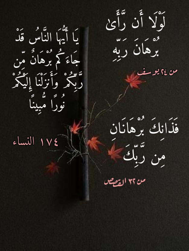 كما ووردت كلمة “برهان” في موطنَين قرآنَين إثنين بمعنى ذي صلةٍ بتجلِّي أمرِ اللهِ تعالى تدخُلاً مباشراً في سيرِ أحداثِ هذا الوجود خَرقَ اللهَ تعالى به المألوفات خرقاً لا يزالُ حتى هذا اليوم يُحيِّرُ العقولَ والألباب: (وَأَنْ أَلْقِ عَصَاكَ فَلَمَّا رَآهَا تَهْتَزُّ كَأَنَّهَا جَانٌّ وَلَّى مُدْبِرًا وَلَمْ يُعَقِّبْ يَا مُوسَى أَقْبِلْ وَلَا تَخَفْ إِنَّكَ مِنَ الْآمِنِينَ. اسْلُكْ يَدَكَ فِي جَيْبِكَ تَخْرُجْ بَيْضَاءَ مِنْ غَيْرِ سُوءٍ وَاضْمُمْ إِلَيْكَ جَنَاحَكَ مِنَ الرَّهْبِ فَذَانِكَ بُرْهَانَانِ مِنْ رَبِّكَ إِلَى فِرْعَوْنَ وَمَلَئِهِ إِنَّهُمْ كَانُوا قَوْمًا فَاسِقِينَ) (31- 32 القصص)، و(وَلَقَدْ هَمَّتْ بِهِ وَهَمَّ بِهَا لَوْلَا أَنْ رَأَى بُرْهَانَ رَبِّهِ كَذَلِكَ لِنَصْرِفَ عَنْهُ السُّوءَ وَالْفَحْشَاءَ إِنَّهُ مِنْ عِبَادِنَا الْمُخْلَصِين) (24 يوسف).