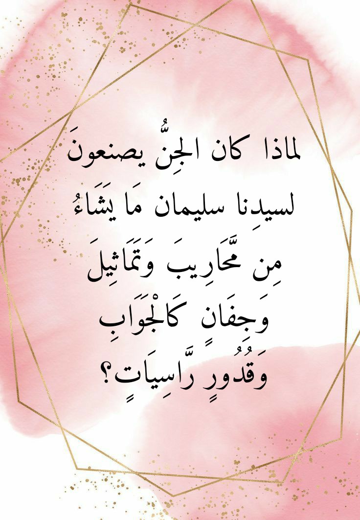 ومن هذه الآياتِ الكريمةِ أيضاً ما جاءتنا به سورةُ سبأ في الآية الكريمة 13 منها (يَعْمَلُونَ لَهُ مَا يَشَاءُ مِنْ مَحَارِيبَ وَتَمَاثِيلَ وَجِفَانٍ كَالْجَوَابِ وَقُدُورٍ رَاسِيَاتٍ اعْمَلُوا آلَ دَاوُدَ شُكْرًا وَقَلِيلٌ مِنْ عِبَادِيَ الشَّكُورُ). والسؤالُ هنا: لماذا أرادَ سيدُنا سليمان أن يصنعَ له الجنُّ كلَّ هذه المصنوعات؟ وهنا ينبغي علينا أن نأخذَ بنظرِ الاعتبارِ حقيقةً مفادها ألا نسبةَ هناك ولا تناسبَ بين هذا الذي بمقدورِ الإنسِ أن يصنعوه، وذاك الذي بمقدورِ الجن أن يصنعوه. فالقوانينُ الفيزيائية التي تُحدِّدُ قدرةَ يدِ الإنسانِ على التعاملِ مع الصخرِ والطين لا تسري على الجن على الإطلاق. فمصنوعاتُ الجنِّ تتمايزُ عن مصنوعاتِ الإنس بما يجعلُ الناظرَ إليها يحارُ في أمرِها، وذلك لما يرى فيها من ضخامةٍ تُعجِزُ الإنسانَ عن أن يصنعَ مثلها. وهذا هو كلُّ ما كان يحتاجُ إليه سيدُنا سليمان حتى يضطرَّ زائريه من ملوكٍ وأُمراء إلى الإقرارِ بأنَّ اللهَ أكبرُ من آلهتِهم طالما كان اللهُ بمقدورِه أن يؤيِّدَه عليه السلام بما تعجزُ عنه آلهتُهم. فهذا “الإبهارُ السُليماني” إذاً هو العلةُ من وراءِ ما كان يقصدُ إليه ِسيدُنا سليمان بأمرِه الجن أن يصنعوا ما فصلته لنا الآية الكريمة 13 من سورة سبأ الواردة أعلاه.