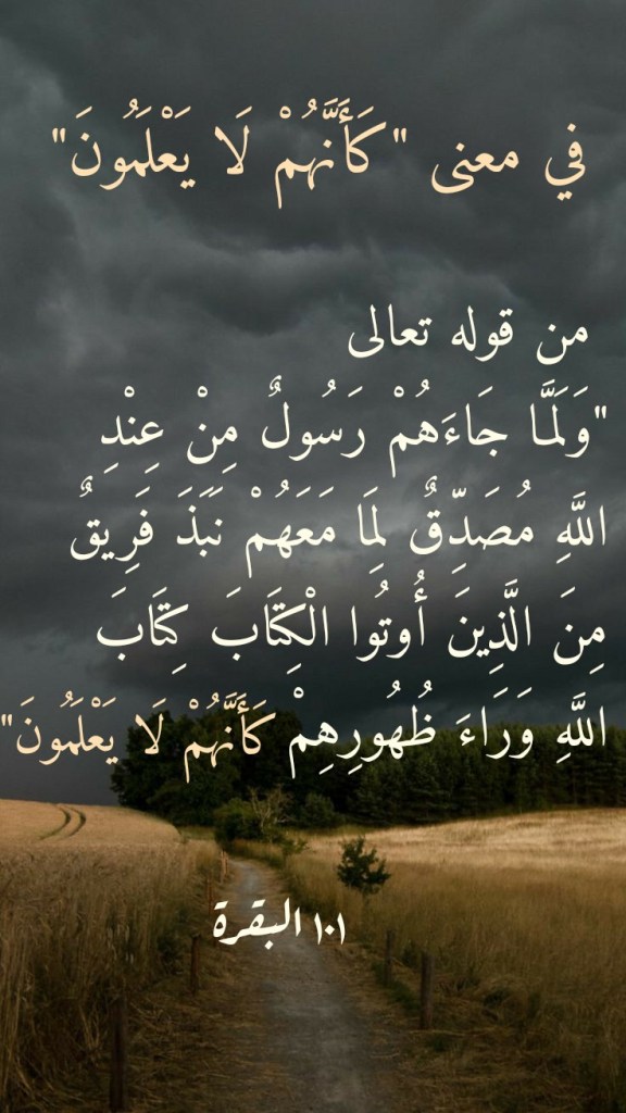 ما الذي يقصدُ إليه المقطع القرآني الجليل “كَأَنَّهُمْ لَا يَعْلَمُونَ” الوارد في الآية الكريمة 101 من سورة البقرة “وَلَمَّا جَاءَهُمْ رَسُولٌ مِنْ عِنْدِ اللَّهِ مُصَدِّقٌ لِمَا مَعَهُمْ نَبَذَ فَرِيقٌ مِنَ الَّذِينَ أُوتُوا الْكِتَابَ كِتَابَ اللَّهِ وَرَاءَ ظُهُورِهِمْ كَأَنَّهُمْ لَا يَعْلَمُونَ”؟