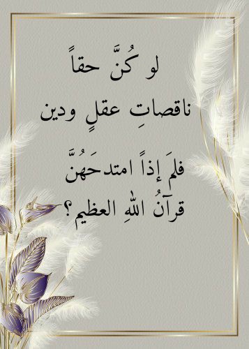 إلى النساءِ بعينِ الهوى لا بعينِ عقلٍ جعلَه تديُّنُه بدينِ اللهِ تعالى لا يقولُ فيهن إلا ما لا يُغضِبُ الله. فلماذا يُصِرُّ كثيرٌ منا على أن يقولَ في النساءِ ما لم يقُلهُ فيهنَّ قرآنُ اللهِ العظيم؟! ولماذا هذا الإصرارُ على نعتِهِنَّ بما ليس فيهنَّ من نقصِ دينٍ وعقل؟!
