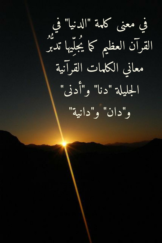 وبعد هذه المقدمة، لابد لنا من أن نتبيَّنَ العلةَ من وراءِ تسميةِ اللهِ تعالى لحياتِنا على هذه الأرض بـ “الدنيا”. فنحنُ إن تدبَّرنا ما وردَ في القرآنِ العظيم من آياتٍ كريمة ترِدُ فيها كلماتٍ ذاتِ صلة بـ “الدنيا”، وذلك على قدرِ تعلُّقِ الأمر بالجذر اللغوي الذي تشعبت عنه هذه الكلماتُ كلُّها جميعاً، فإننا سنجدُ أنَّ هذه العلةَ موصولةٌ بالمعنى الذي بوسعِنا أن نقعَ عليه بتدبُّرِنا كلمتَي “الدنو” و”القرب”. فكلماتٌ من مثل “دنا” و”أدنى” و”دانٍ” و”دانية” تشتركُ كلُّها جميعاً في هذا المعنى الذي أخفقَ التفسيرُ التقليدي في الإحاطةِ به، وذلك بسببٍ مما تقدَّم بيانُه وتبيانُه. فلنأخذ مثالاً على ذلك الكلمة القرآنية الجليلة “دنا”، والتي وردت مرةً واحدةً في القرآن العظيم، وذلك في الآية الكريمة 8 من سورة النجم (ثُمَّ دَنَا فَتَدَلَّى). ألا يدلُّ المعنى الذي تنطوي عليهِ هذه الكلمة الكريمة على كلِّ ما هو ذو صلةٍ بالقربى والتقرُّبِ؟
