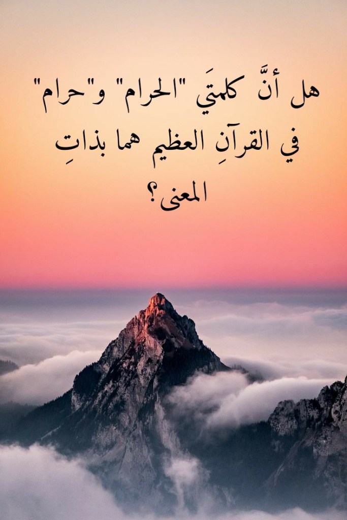 ومن ذلك ما بوسعنا أن نتبيَّنَه بتدبُّرِ مواطنِ ورودِ كلمةِ “الحرام” وكلمة “حرام” في القرآن العظيم. فهاتان الكلمتان، وإن كانتا “متجانستَين” في المبنى، فإنهما مختلفتان بالتمام والكلية في المعنى، وذلك على قدر تعلُّق الأمر بمواطنِ ورودِهما في القرآن العظيم. فمعنى كلمة “الحرام” في القرآن العظيم لا علاقةَ له من قريبٍ أو بعيد بالمعنى الذي تشتملُ عليه كلمةُ “حرام” فيه (قُلْ أَرَأَيْتُمْ مَا أَنْزَلَ اللَّهُ لَكُمْ مِنْ رِزْقٍ فَجَعَلْتُمْ مِنْهُ حَرَامًا وَحَلَالًا) (من 59 يونس)، (وَلَا تَقُولُوا لِمَا تَصِفُ أَلْسِنَتُكُمُ الْكَذِبَ هَذَا حَلَالٌ وَهَذَا حَرَامٌ) (من 116 النحل)، (وَحَرَامٌ عَلَى قَرْيَةٍ أَهْلَكْنَاهَا أَنَّهُمْ لَا يَرْجِعُونَ) (95 الأنبياء).