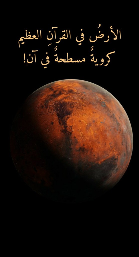 يتبيَّنُ لنا إذاً، وبتدبُّرِ ما تقدَّم، ألا تناقضَ هنالك على الإطلاق بين ما يقولُ به العلمُ من أن الأرضَ كرويةٌ، وما يقولُ به القرآنُ العظيم من أنَّ “الأرض” مسطحةٌ!!! فكلمة “الأرض” في الآياتِ الكريمةِ التي ورد فيها ذكرُ الأرض على أنَّها مسطَّحةٌ هي غيرُ كلمة “الأرض” في الآياتِ الكريمة التي تُذكرُ فيها الأرض على أنها “الجُرمُ” الذي هو ضديدُ السمواتِ وذلك على قدرِ تعلُّقِ الأمر بما تتمايزُ به الأرضُ عن السمواتِ مكاناً ومكانة.