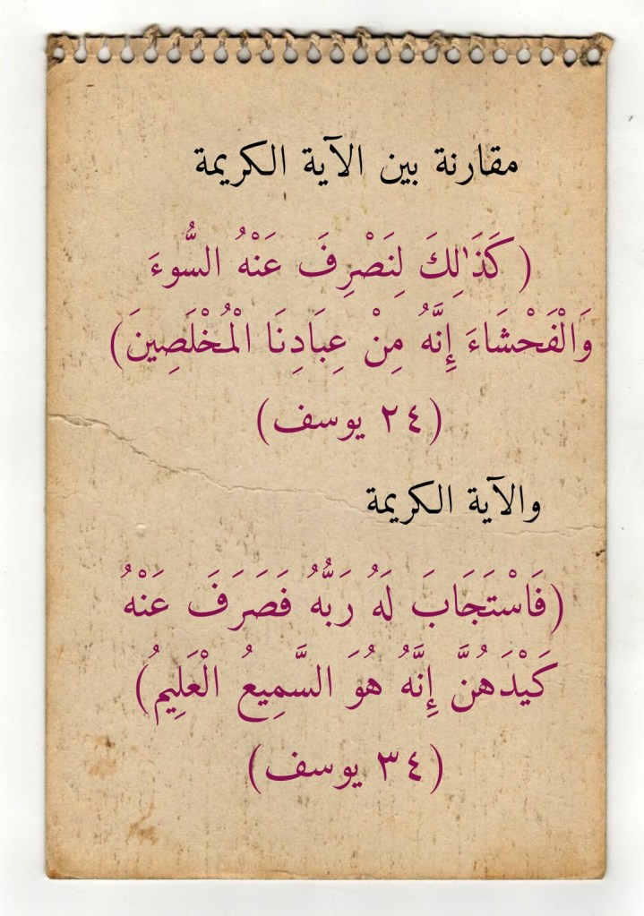 ما الذي بوسعنا أن نخلُصَ إليه بتدبُّرنا ما جاءتنا به سورةُ يوسف في آيتَيها الكريمتن: (كَذَلِكَ لِنَصْرِفَ عَنْهُ السُّوءَ وَالْفَحْشَاءَ إِنَّهُ مِنْ عِبَادِنَا الْمُخْلَصِينَ) (من 24 يوسف) و(فَاسْتَجَابَ لَهُ رَبُّهُ فَصَرَفَ عَنْهُ كَيْدَهُنَّ إِنَّهُ هُوَ السَّمِيعُ الْعَلِيمُ) (34 يوسف)؟