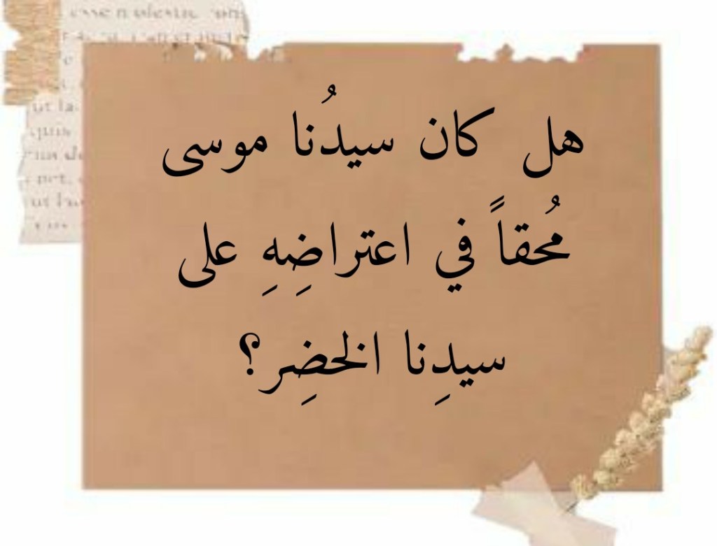ويرى كثيرٌ منا في هذا الذي بدرَ عن سيدِنا موسى من اعتراضاتٍ على سيدِنا الخضر ما يظنُّ أنَّه متفقٌ تمامَ الاتِّفاقِ مع ما يقضي به العقلُ والمنطقُ وتؤيدهما فيما يذهبان إليه الشريعة! ولو أنَّنا استذكرنا ما جاءتنا به سورةُ الكهف من تفاصيلَ توثِّقُ للقاء سيدِنا موسى بسيدِنا الخضر، لتبيَّنَ لنا أنَّ سيدَنا موسى لم يكن مُحقاً في اعتراضِه على سيدِنا الخضر.