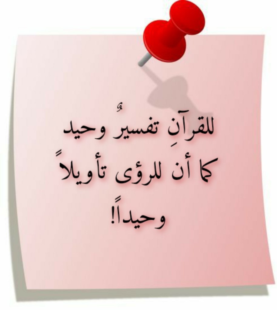 والآن، فإذا كان هذا هو ما هي عليه الرؤى حقاً وحقيقة، وما هو عليه حقاً وحقيقةً تأويلها، فكيف يريدُنا “عشاق التفاسير” أن نصدِّقَ معهم أنَّ لآياتِ القرآنِ العظيم تفسيراتٍ متعددةً وليس تفسيراً واحداً؟! فكما أن للرؤى تأويلاً واحداً، فللقرآنِ العظيمِ أيضاً تفسيرٌ واحد! فالقرآنُ العظيم هو من عندِ الله، ولذلك فلا ينبغي أن يكونَ له أكثرُ من تفسيرٍ واحد هو “الضامنُ الوحيد” كي لا نختلفَ في هذا القرآنِ اختلافَنا الذي جرَّه علينا إخفاقُنا في تبيُّنِ ما جاءتنا به سورةُ النساء في آيتها الكريمة 82 (أَفَلَا يَتَدَبَّرُونَ الْقُرْآنَ وَلَوْ كَانَ مِنْ عِنْدِ غَيْرِ اللَّهِ لَوَجَدُوا فِيهِ اخْتِلَافًا كَثِيرًا). فلو أننا لم نَحِد عن هذا الذي جاءتنا به هذه الآية الكريمة لما كان حالُنا اليوم فِرقةً وتفرُّقاً وافتراقاً على ما ليس باليسيرِ إحصاؤه من الفِرَقِ والمذاهبِ والأحزاب التي يزعمُ كلُّ واحدٍ منها أنَّه الأحقُّ لأن يدورَ الحقُّ حيثما دار!