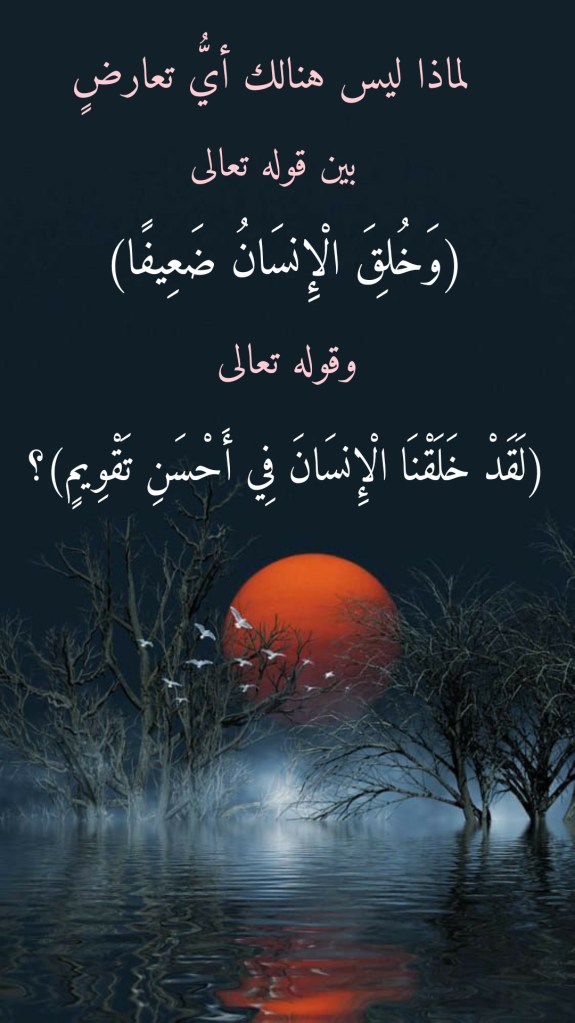 ولذلك تُخفقُ كلُّ محاولات المُشككين في إلهية القرآن العظيم، ومن ذلك ما يذهب إليه أولئك الذين يجادلون في آيات الله بغير علم إذ يتوهمون أن هناك “تناقضاً بيِّناً” بين ما جاءتنا به سورةُ النساء في الآية الكريمة 28 منها (وَخُلِقَ الْإِنسَانُ ضَعِيفًا) وما جاءتنا به سورة التين في الآية الكريمة 4 منها (لَقَدْ خَلَقْنَا الْإِنسَانَ فِي أَحْسَنِ تَقْوِيمٍ)!