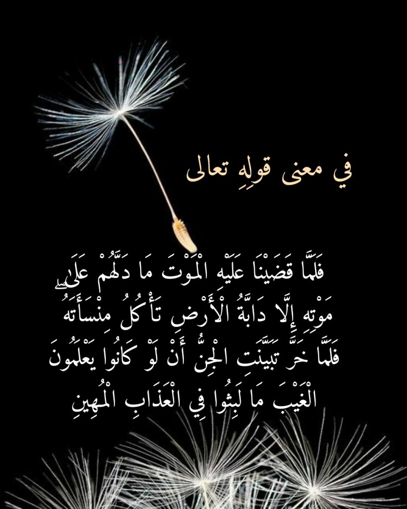 ولنأخذ مثالاً على ذلك ما جاءتنا به سورة سبأ في الآيةِ الكريمة 14 منها: (فَلَمَّا قَضَيْنَا عَلَيْهِ الْمَوْتَ مَا دَلَّهُمْ عَلَىٰ مَوْتِهِ إِلَّا دَابَّةُ الْأَرْضِ تَأْكُلُ مِنْسَأَتَهُ فَلَمَّا خَرَّ تَبَيَّنَتِ الْجِنُّ أَنْ لَوْ كَانُوا يَعْلَمُونَ الْغَيْبَ مَا لَبِثُوا فِي الْعَذَابِ الْمُهِينِ).