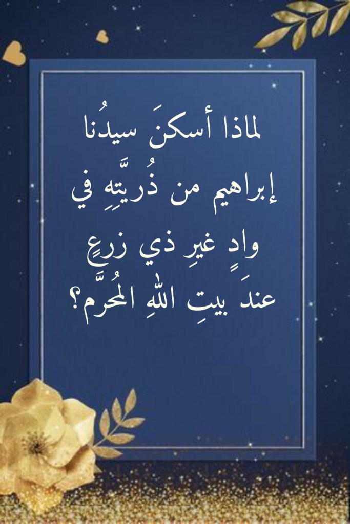 أسكن سيدُنا إبراهيمُ من ذريته بوادٍ غير ذي زرعٍ عند بيتِ اللهِ المحرم: (رَّبَّنَا إِنِّي أَسْكَنتُ مِن ذُرِّيَّتِي بِوَادٍ غَيْرِ ذِي زَرْعٍ عِندَ بَيْتِكَ الْمُحَرَّمِ رَبَّنَا لِيُقِيمُوا الصَّلَاةَ فَاجْعَلْ أَفْئِدَةً مِّنَ النَّاسِ تَهْوِي إِلَيْهِمْ وَارْزُقْهُم مِّنَ الثَّمَرَاتِ لَعَلَّهُمْ يَشْكُرُونَ) (37 إبراهيم). فما الذي جعل سيدَنا إبراهيمَ يفعلُ ذلك وهو يعلم علمَ اليقين أن المكان الذي ترك فيه ابنَه اسماعيل وأمَّه هاجر هو أرضٌ جرداءٌ قاحلة لا نبات فيها ولا ماء؟