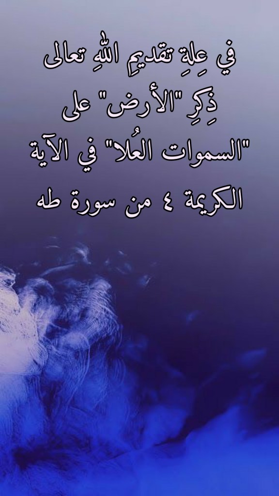 غيرَ أنَّ هنالكَ مواطنَ في القرآنِ العظيم قُدِّمَ فيها ذكرُ الأرضِ على “السموات”، ومنها ما جاءتنا به سورةُ طه في الآيةِ الكريمةِ ٤ منها (تَنْزِيلًا مِمَّنْ خَلَقَ الْأَرْضَ وَالسَّمَاوَاتِ الْعُلَى). فما العلةُ من وراءِ هذا التبايُنِ في التقديمِ والتأخير؟