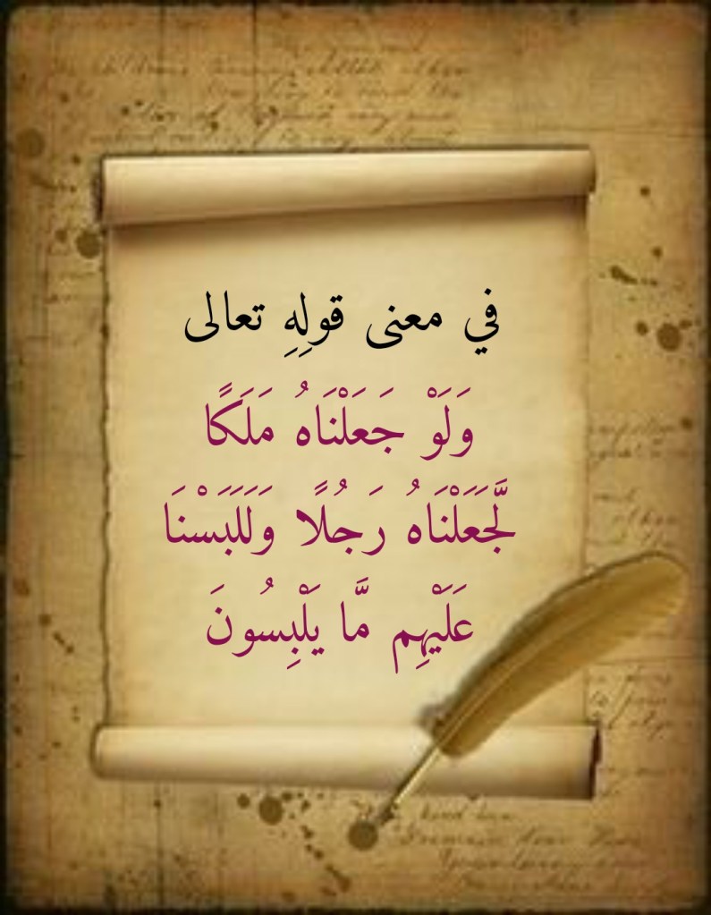 إن ما تقدمَ بيانُه أمرٌ لابد منه حتى يكون بمقدورنا أن نتدبر ما جاءتنا به الآية الكريمة 9 من سورة الأنعام: (وَلَوْ جَعَلْنَاهُ مَلَكًا لَّجَعَلْنَاهُ رَجُلًا وَلَلَبَسْنَا عَلَيْهِم مَّا يَلْبِسُونَ). إذ يتبين لنا بتدبر هذه الآية الكريمة أن المعنى الذي تنطوي عليه بالإمكان ايجازه بالكلمات التالية: “إن اللهَ تعالى قادرٌ على أن يجعلَ مَن يشاءُ مِن ملائكته يتمثَّل بشراً سوياً لن يكون بمقدور أحدٍ من بني آدمَ ان يُمايزَ بينه وبين أي آدميٍ”. ولذلك فلا معنى هنالك على الإطلاق لاعتراضِ كفار قريش على رسول الله صلى الله تعالى عليه وسلم والذي فصَّلته لنا سورةُ الأنعام في الآيتين الكريمتين اللتين تسبقانها (وَلَوْ نَزَّلْنَا عَلَيْكَ كِتَابًا فِي قِرْطَاسٍ فَلَمَسُوهُ بِأَيْدِيهِمْ لَقَالَ الَّذِينَ كَفَرُوا إِنْ هَٰذَا إِلَّا سِحْرٌ مُّبِينٌ. وَقَالُوا لَوْلَا أُنزِلَ عَلَيْهِ مَلَكٌ وَلَوْ أَنزَلْنَا مَلَكًا لَّقُضِيَ الْأَمْرُ ثُمَّ لَا يُنظَرُونَ) (7-8 الأنعام).