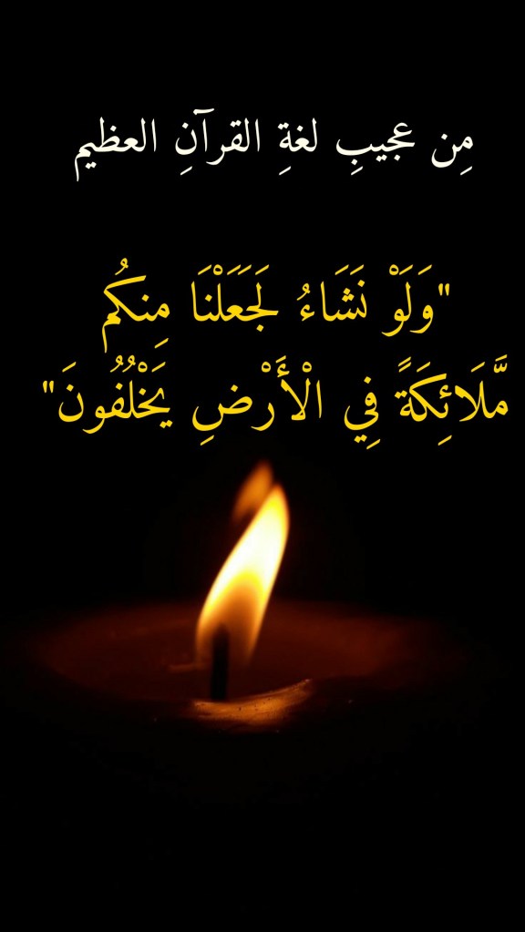 فكثيرٌ منا يظنُ واهماً بأن المعنى الذي تنطوي عليه هذه الآية الكريمة واضحٌ جليٌ جَلاءَ الشمسِ رابعةَ النهار! إلا أن هذا الظن الواهم هو أبعدُ ما يكون عن الحقيقة! ويكفينا أن نستوثق هذا الأمرَ وذلك بأن نستعرضَ ما وردَ بشأن هذه الآية الكريمة في ما بينَ أيدينا من تفاسيرَ شتى ونقارنَهُ بما تُحيلنا إليه قراءتُها بلسانِ القرآن العربي المبين. فوفقاً لهذا اللسان الكريم فإن المعنى الذي تنطوي عليه هذه الآية الكريمة بالإمكان ايجازه بالكلمات التالية: “ولو نشاءُ لجعلنا “من بعدكم”، معشرَ بني آدم، ملائكةً في الأرضِ يخلِفونكم”.