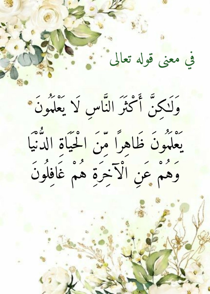 تُقدمُ لنا سورة الروم وفي الآيتين الكريمتين ٦ و ٧ منها تبياناً للعلةِ من وراءِ كون “أكثر الناسِ لا يعلمون”: (وَلَٰكِنَّ أَكْثَرَ النَّاسِ لَا يَعْلَمُونَ . يَعْلَمُونَ ظَاهِرًا مِّنَ الْحَيَاةِ الدُّنْيَا وَهُمْ عَنِ الْآخِرَةِ هُمْ غَافِلُونَ).