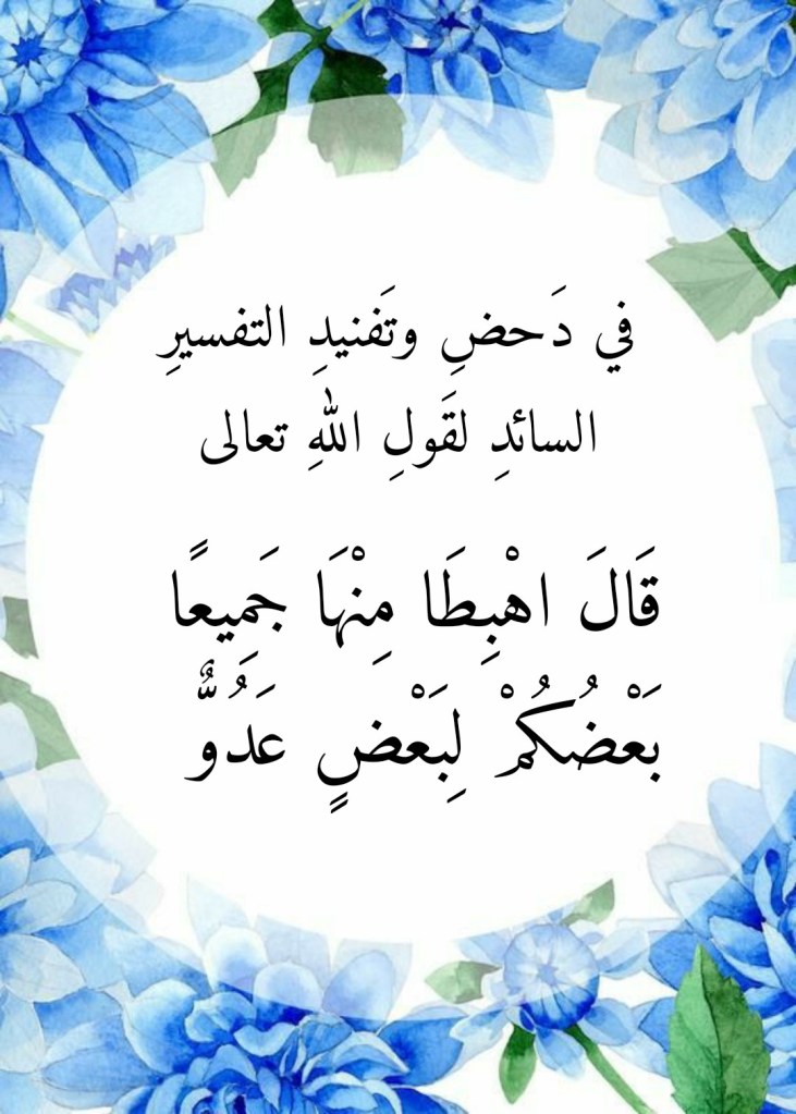 وحتى يتبينَ لنا مدى الجَورِ الذي جارَ به هؤلاء على قرآن الله العظيم فلا مناص هناك من أن نتدبر قول الله تعالى آنف الذكر وذلك من بعد استذكار هذا الذي جارَ به هؤلاء على ما جاءنا به قرآنُ الله العظيم بقوله “بَعْضُكُمْ لِبَعْضٍ عَدُوٌّ”. فالقومُ يقولون بأن العداوةَ البينيةَ المتبادلة التي يُشيرُ إليها قول الله تعالى هذا إنما هي بين الإنسانِ والشيطان أو بمعنى أدق: “بين آدمَ وذريته وبين الشيطانِ وقبيله”! فهل بعد هذا القولِ من جانبِ هؤلاء ما يقالُ؟! فالقومُ قد أعرضوا عن ما جاءهم به قرآنُ اللهِ العظيم من تفصيلٍ وتبيانٍ لهوية أولئك الذين تحتم عليهم أن يكون بعضهم لبعضٍ عدو، وأنهم البشرُ ولا أحد غيرَهم. فالبشرُ هم الذي قُدِّرَ لهم أن يكونَ بعضُهم لبعضٍ عدو، والبشرُ هم مَن عَناهم اللهُ تعالى بكلماتِ قرآنه العظيم التي وردت بعد قوله تعالى “بَعْضُكُمْ لِبَعْضٍ عَدُوٌّ”: (قَالَ اهْبِطُوا بَعْضُكُمْ لِبَعْضٍ عَدُوٌّ وَلَكُمْ فِي الْأَرْضِ مُسْتَقَرٌّ وَمَتَاعٌ إِلَىٰ حِينٍ . قَالَ فِيهَا تَحْيَوْنَ وَفِيهَا تَمُوتُونَ وَمِنْهَا تُخْرَجُونَ) (٢٤-٢٥ الأعراف).