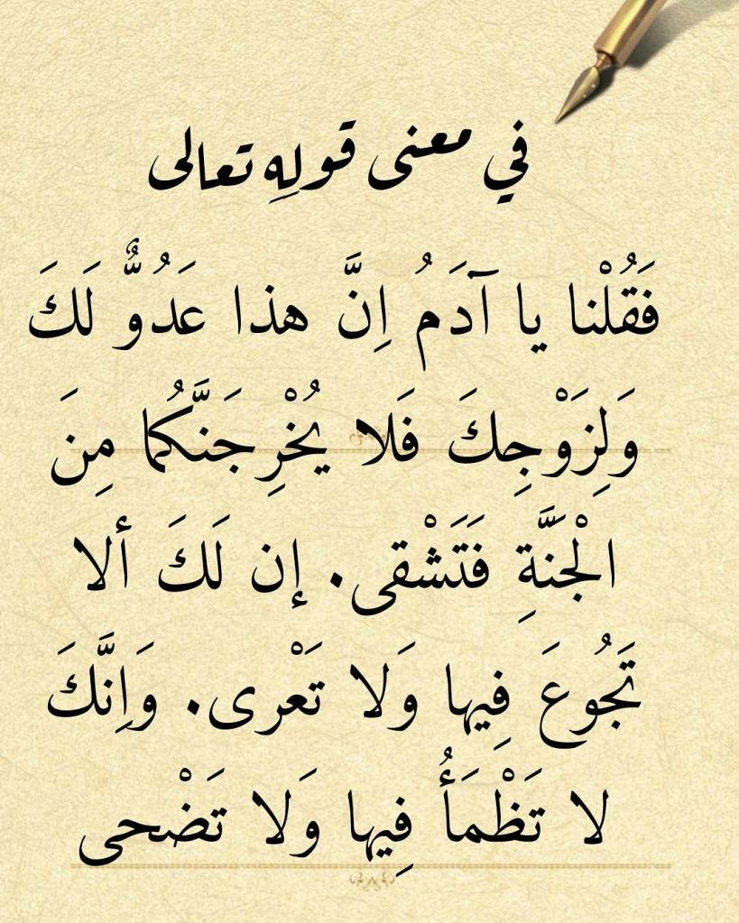 إن التدبُّر في الآيات الكريمة (فَقُلْنا يا آدَمُ اِنَّ هذا عَدُوٌّ لَكَ وَلِزَوْجِكَ فَلا يُخْرِجَنَّكُما مِنَ الْجَنَّةِ فَتَشْقى. إن لَكَ ألا تَجُوعَ فِيها وَلا تَعْرى. وَاِنَّكَ لا تَظْمَأُ فِيها وَلا تَضْحى) [طه: 117-119] يكشف لنا وبكل وضوح أن آدم كان يعرف الجوع والعطش قبل أن يُدخله اللهُ الجنة! وهذا يدل على أنه كان قد جرّب الجوع والعطش اِبان حياته على كوكبنا الأرضي بين ظَهراني قومه البائدين! كما انها تكشف عن كونه قد كابد الشقاء وجرّبه عندما كان بمعية قومه الظالمين. إن الجوع والعطش والشقاء هي بعض نتائج الحياة خروجاً على قوانين الطبيعة كما كان حال قوم آدم المجرمين مقارنةً بحال حيوانات الطبيعة التي لا تعرف الجوع أو العطش أو الشقاء وذلك لتناغمها في حياتها مع قوانين الطبيعة!
