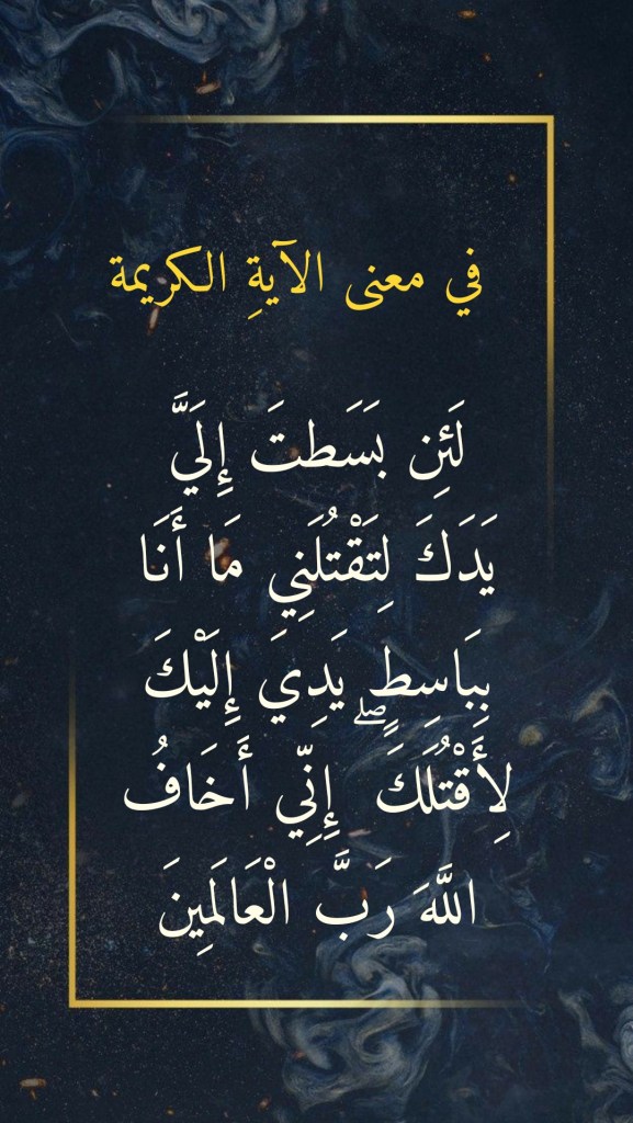 تقصُ علينا سورة المائدة بعضاً مما جرى بين إبنَي سيدنا آدمَ وذلك قُبيل إقدام أحدهما على قتل أخيه: (وَاتْلُ عَلَيْهِمْ نَبَأَ ابْنَيْ آدَمَ بِالْحَقِّ إِذْ قَرَّبَا قُرْبَانًا فَتُقُبِّلَ مِنْ أَحَدِهِمَا وَلَمْ يُتَقَبَّلْ مِنَ الْآخَرِ قَالَ لَأَقْتُلَنَّكَ ۖ قَالَ إِنَّمَا يَتَقَبَّلُ اللَّهُ مِنَ الْمُتَّقِينَ . لَئِن بَسَطتَ إِلَيَّ يَدَكَ لِتَقْتُلَنِي مَا أَنَا بِبَاسِطٍ يَدِيَ إِلَيْكَ لِأَقْتُلَكَ ۖ إِنِّي أَخَافُ اللَّهَ رَبَّ الْعَالَمِينَ) (٢٧-٢٨ المائدة).