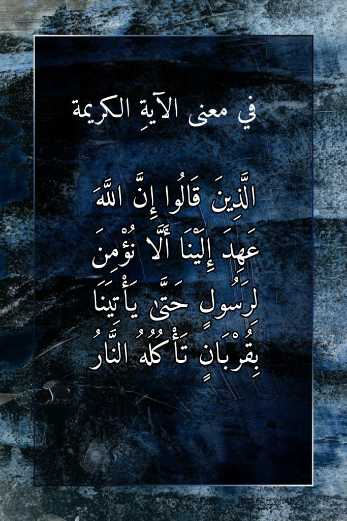 ولذلك فلقد عهِدَ اللهُ تعالى إلى عبادِهِ بألا يؤمنوا من فَورهم لكلِّ مَن يدَّعي أنه مُرسَلٌ من عنده، فجعلَ آيةَ نبوةِ ورسالةِ النبي المُرسَلِ من عندِه ناراً تنزِلُ من السماءِ تلتهمُ القربانَ الذي أمرَهم بأن يتقرَّبوا به إليه وذلك بأن يجريَ تقديمُ القربانِ وتقريبُه في موضعٍ محدَّدٍ من الأرضِ يُسمى “المذبح”، فإن نزلت النارُ من السماءِ فأتت على القربان كان في ذلك آيةٌ على نبوَّتِهِ ورسالتِه.