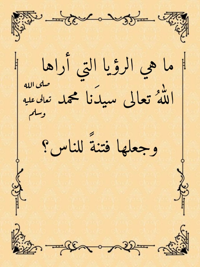 نقرأُ في الآية الكريمة 60 من سورةِ الإسراء (وَإِذْ قُلْنَا لَكَ إِنَّ رَبَّكَ أَحَاطَ بِالنَّاسِ وَمَا جَعَلْنَا الرُّؤْيَا الَّتِي أَرَيْنَاكَ إِلَّا فِتْنَةً لِلنَّاسِ). فما هي هذه الرؤيا؟ ولماذا جعلَها اللهُ تعالى فتنةً للناس؟