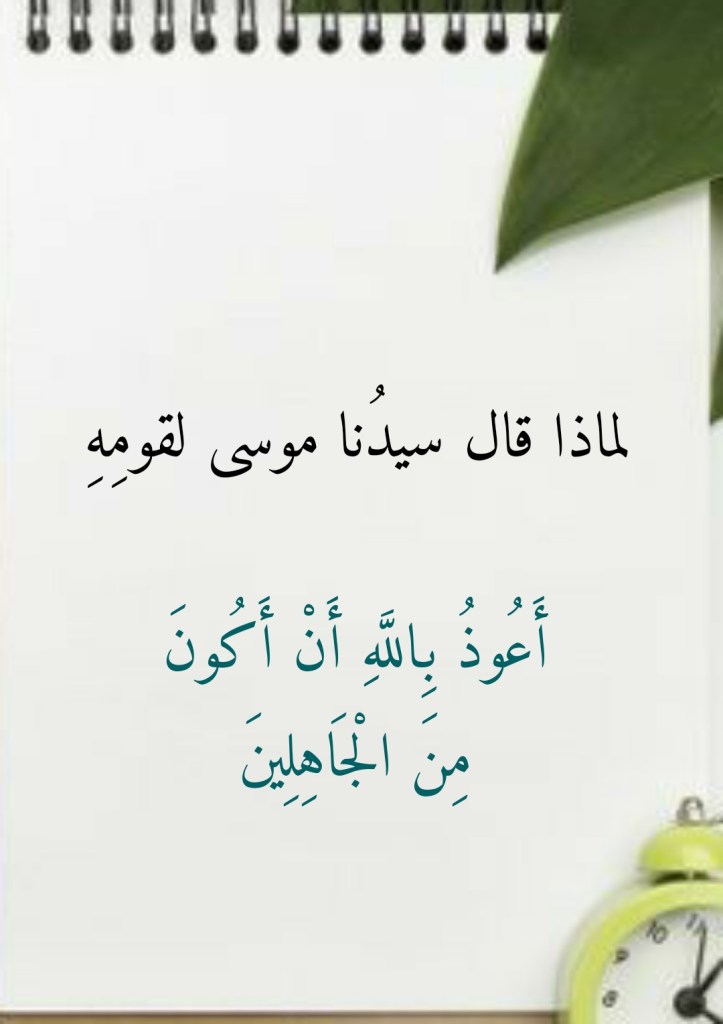 (وَإِذْ قَالَ مُوسَى لِقَوْمِهِ إِنَّ اللَّهَ يَأْمُرُكُمْ أَنْ تَذْبَحُوا بَقَرَةً قَالُوا أَتَتَّخِذُنَا هُزُوًا قَالَ أَعُوذُ بِاللَّهِ أَنْ أَكُونَ مِنَ الْجَاهِلِينَ) (67 البقرة).