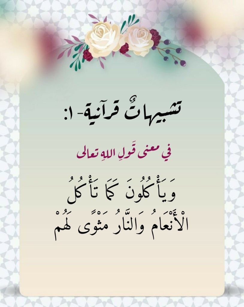 ولذلك فإنك تراهم يأكلون وهم عن نارِ الآخرةِ غافلون؛ تلك النارُ التي وعدَ اللهُ تعالى كلَّ من أعرضَ عن هُداه واتَّخذَ إلهَهُ هَواه. ومثَلُهم في ذلك كمثَلِ الأنعامِ التي تأكلُ وهي غافلةٌ عن مصيرِها المحتوم. ولذلك فالأمرُ لا علاقةَ له، من قريبٍ أو بعيد، بما ذهبَ إليه كثيرٌ منا من “استصغارٍ” للحيوانِ الذي جُلُّ همِّهِ الأكل! فاللهُ تعالى لا يَعيبُ على الإنسانِ انشغالَه بالأكلِ، إذ يصفُه بأنه يأكلُ كما تأكلُ الأنعام، إلا بما في الأمرِ من تذكرةٍ بهذا الذي هي عليه الأنعامُ من غفلةٍ عن مصيرِها المحتوم!