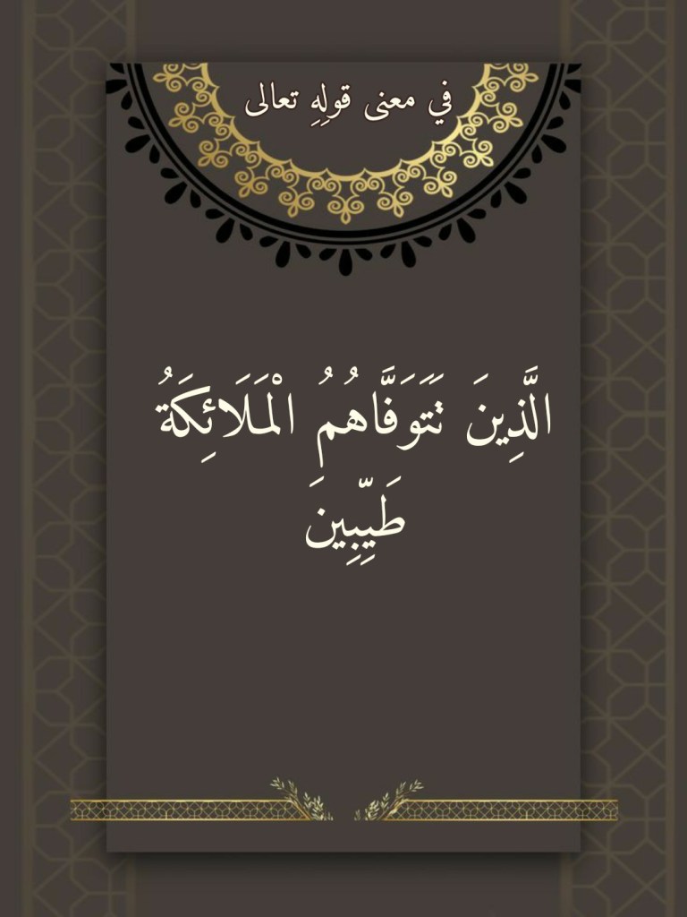 1- (كَذَلِكَ يَجْزِي اللَّهُ الْمُتَّقِينَ. الَّذِينَ تَتَوَفَّاهُمُ الْمَلَائِكَةُ طَيِّبِينَ يَقُولُونَ سَلَامٌ عَلَيْكُمُ ادْخُلُوا الْجَنَّةَ بِمَا كُنْتُمْ تَعْمَلُون) (من 31- 32 النحل).