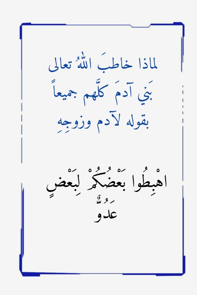 ونحن إذ نتدبَّرُ هذه الآياتِ الكريمة، لابد لنا وأن نتساءلَ عن العلةِ من وراءِ أمرِ اللهِ تعالى لبَني آدم كلِّهم جميعاً بالخروجِ من الجنة، والهبوطِ إلى الأرض، وهم لم يشاركوا أبويَهم، آدم وزوجَه، الأكلَ من تلك الشجرة. فبنو آدم لم يكونوا قد وُلدوا بعد حتى يكونَ لهم أن يأكلوا من تلك الشجرة، فلماذا أخرجهم اللهُ تعالى من الجنةِ إذاً؟