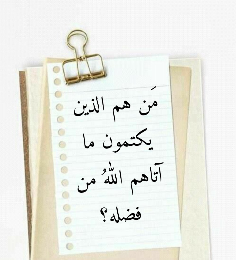 وهؤلاء هم الذين أشارَ إليهم اللهُ تعالى بقولِه “يَكْتُمُونَ مَا آتَاهُمُ اللَّهُ مِنْ فَضْلِهِ”، والواردِ في الآية الكريمة 37 من سورة النساء (إِنَّ اللَّهَ لَا يُحِبُّ مَنْ كَانَ مُخْتَالًا فَخُورًا. الَّذِينَ يَبْخَلُونَ وَيَأْمُرُونَ النَّاسَ بِالْبُخْلِ وَيَكْتُمُونَ مَا آتَاهُمُ اللَّهُ مِنْ فَضْلِهِ وَأَعْتَدْنَا لِلْكَافِرِينَ عَذَابًا مُهِينًا) (من 36- 37 النساء).