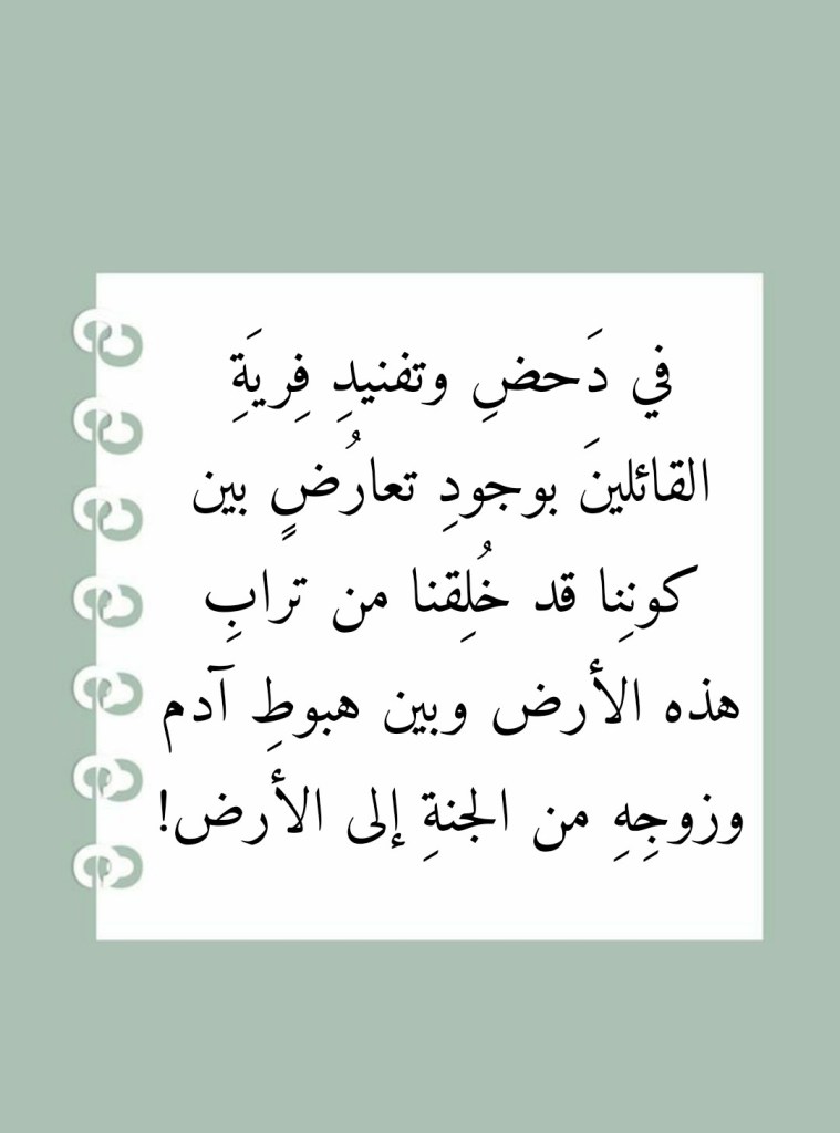 ولو أنَّ القائلين بـ “أرضيةِ” الجنةِ التي سكنها آدم وزوجُه تفكَّروا في الأمرِ قليلاً لما كان ليستعصيَ عليهم أن يتبيَّنوا أنَّ ما قد خالوها حجةً، إنما يدحضُها ويُفنِّدُها ما جاءنا به القرآنُ العظيم من تبيانٍ مفادُه أنَّ آدمَ وزوجَه لم يطُل بهما المقامُ في الجنةِ، وأنهما قد أُخرِجا منها وأُعيدا إلى الأرض التي خلقهما اللهُ من ترابِها!