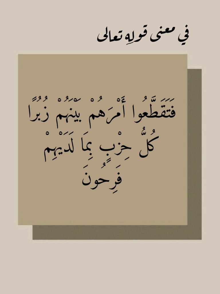 3- (فَتَقَطَّعُوا أَمْرَهُمْ بَيْنَهُمْ زُبُرًا كُلُّ حِزْبٍ بِمَا لَدَيْهِمْ فَرِحُونَ) (53 المؤمنون).
