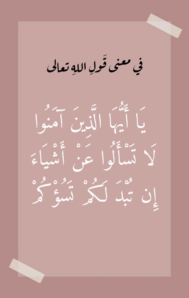مارس 23, 2022 Sufism24/7 في معنى قولِ اللهِ تعالى “يَا أَيُّهَا الَّذِينَ آمَنُوا لَا تَسْأَلُوا عَنْ أَشْيَاءَ إِن تُبْدَ لَكُمْ تَسُؤْكُمْ” شارك هذا الموضوع: النقر للمشاركة على X (فتح في نافذة جديدة) X انقر للمشاركة على فيسبوك (فتح في نافذة جديدة) فيس بوك إعجاب تحميل... مرتبط
