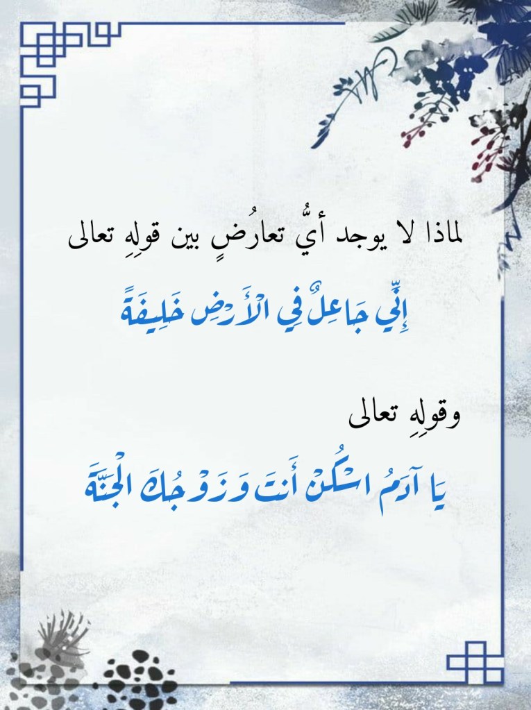 يبرهنُ المُشكِّكون في إلهيةِ القرآنِ العظيم على أنَّهم غيرُ متجرِّدين من الأغراضِ والأهواء، وذلك بهذا الزعمِ من جانبِهم بأنَّ هناك تعارضاً بين قوله تعالى “إِنِّي جَاعِلٌ فِي الْأَرْضِ خَلِيفَةً” وقوله تعالى “يَا آدَمُ اسْكُنْ أَنْتَ وَزَوْجُكَ الْجَنَّةَ”! فلو أنَّ هؤلاءِ المشككين تدبَّروا آياتِ قرآنِ اللهِ العظيم التي فصَّلت قَصَصَ آدم لتبيَّنَ لهم ألا تعارضَ هنالك على الإطلاق بين هذين القولَين الكريمَين!