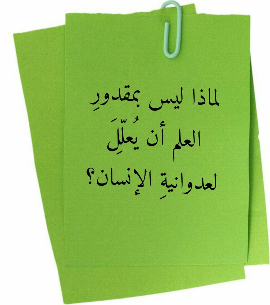 وهكذا يتبيَّنُ لنا أنَّ المنبهرين بالعلمِ لا يملكونَ حجةً تؤيِّدُ زعمَهم بأنَّ بمقدورِ الأصلِ الحيواني للإنسان أن يُعلِّلَ لكلِّ فعاليات الإنسان ومنها “إفراطُه غيرُ الطبيعي” في العدوان! وهذا إن دلَّ فإنما يدلُّ على أنَّ افتقارَ العلمِ لما يُعينُه على أن يُعلِّلَ للعدوانِ غيرِ الطبيعي عند الإنسان قد جعلَه يستعينُ بما هو ليس بعلمي! فادعاءُ العلم بأنَّ الأصلَ الحيواني للإنسان كافٍ ليُعلِّلَ لعدوانيته المفرطة هو “زعمٌ فلسفي” لا يمتُّ بأيِّ صلةٍ لمنهجيةِ العلم التي تقومُ على أساسٍ من الملاحظةِ والتجربة! وبذلك يتبيَّنُ لنا أنَّ العلمَ قد تخلَّى عن منهجيتِه هذه، وذلك حتى لا يُضطرَّ إلى القولِ بما يقولُ به القرآنُ في معرضِ تبيانِه للعلةِ من وراءِ العدوان غيرِ الطبيعي عند الإنسان: (وَقُلْنَا اهْبِطُوا بَعْضُكُمْ لِبَعْضٍ عَدُوٌّ وَلَكُمْ فِي الْأَرْضِ مُسْتَقَرٌّ وَمَتَاعٌ إِلَى حِينٍ) (من 36 البقرة).